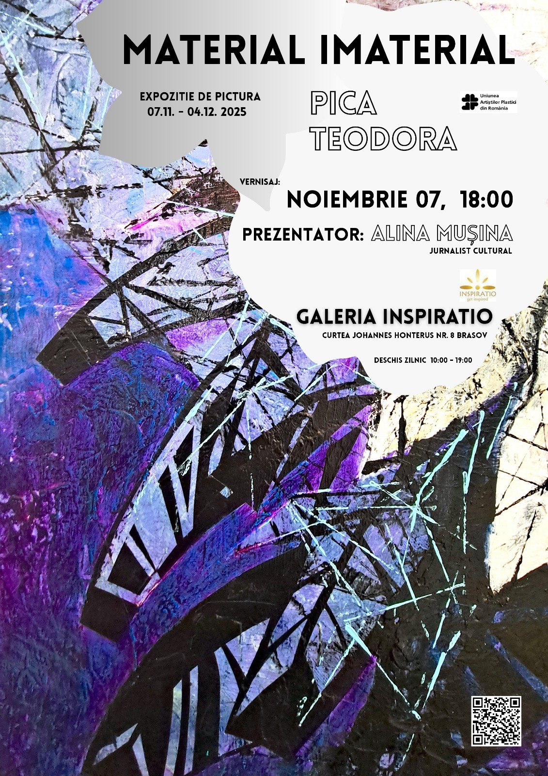Joi, 7 noiembrie 2025, de la ora 18:00, Galeria INSPIRATIO din Brașov va găzdui vernisajul expoziției de pictură „MATERIAL IMATERIAL” semnată de artista brașoveană Teodora Pica. „Teodora Pica se răzvrătește împotriva calmității și a normelor cromatice dezirabile, încurajând angajarea într-o călătorie a simțurilor dincolo de aparențe, un peripluu conceptual elaborat cu rigoare și consecvență de […]