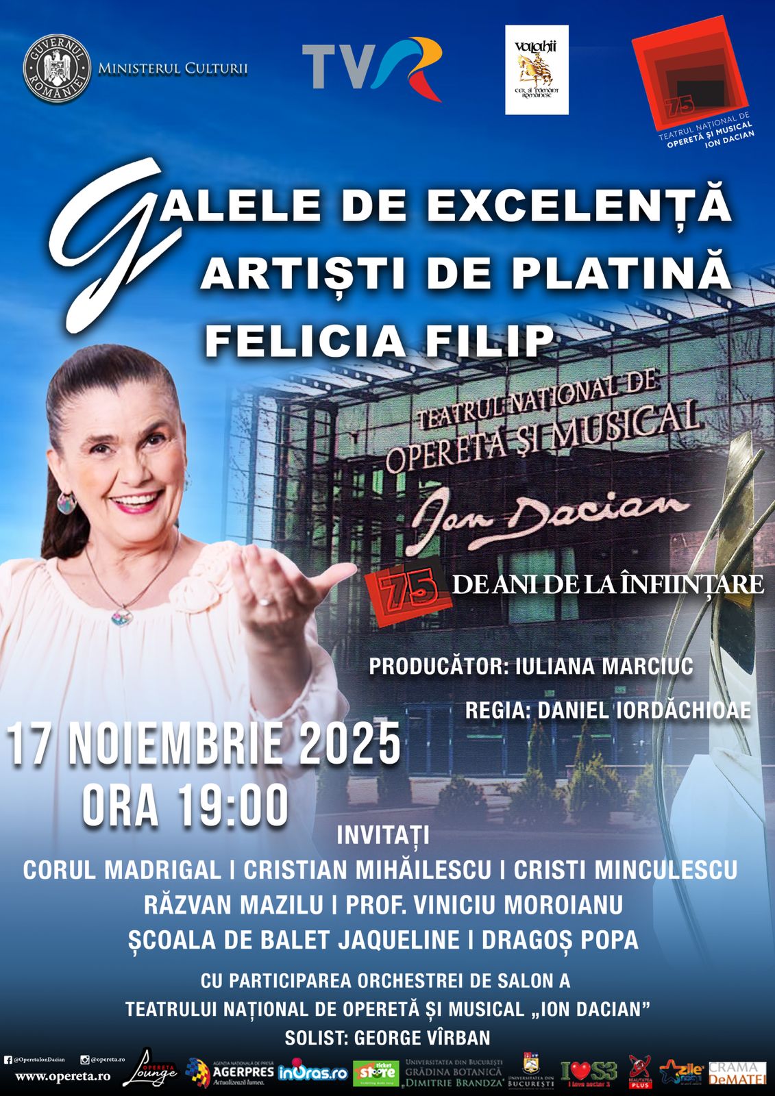 În data de 17 noiembrie 2025, de la ora 19:00, Teatrul Național de Operetă și Musical „Ion Dacian” din București va găzdui un eveniment de excepție: „Galele de Excelență – Artiști de Platină – Felicia Filip”, un spectacol dedicat uneia dintre cele mai îndrăgite voci ale scenei lirice românești. După succesul primelor trei ediții, care […]