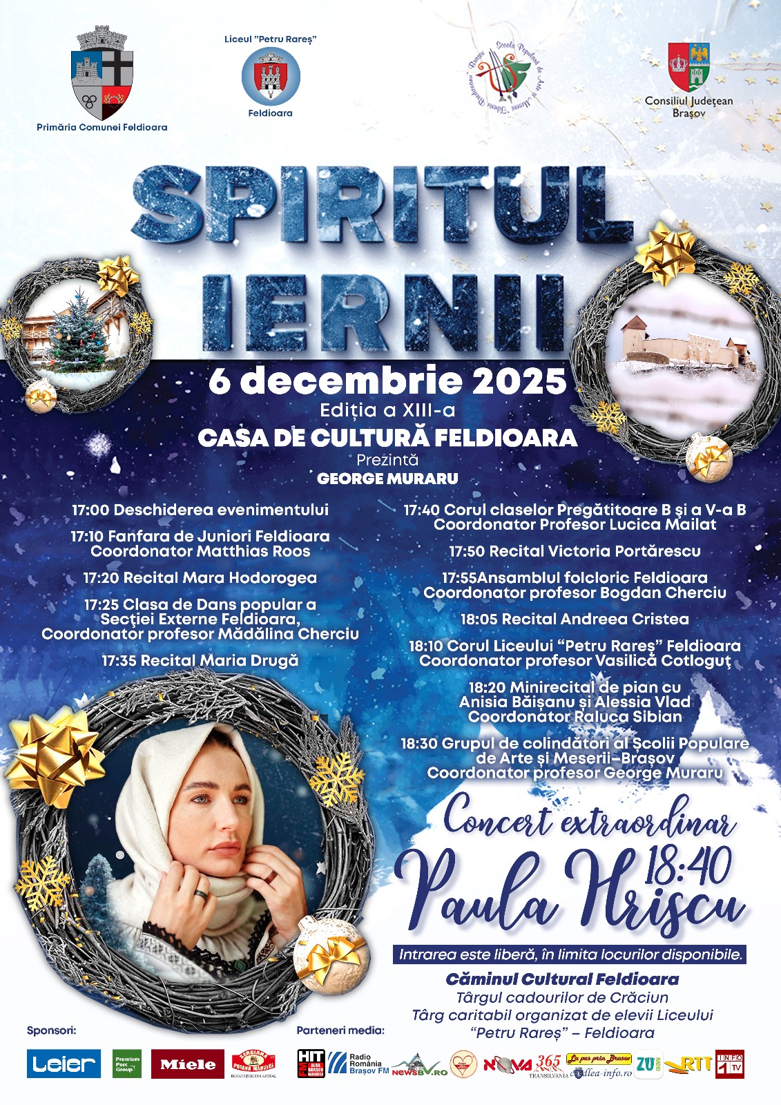 “Spiritul Iernii“ revine la Feldioara ȋn ziua Sfântului Nicolae, pe 6 decembrie, ca ȋn fiecare an, şi aduce, prin cea de-a XIII-a ediţie, atmosfera sărbătorilor de iarnă. Iniţiat ȋn anul 2011 ȋn cadrul proiectului “Obiective culturale, tradiţii și obiceiuri ȋn Comuna Feldioara”, evenimentul a fost susţinut de Primăria Feldioara ca parte a strategiei de valorificare […]