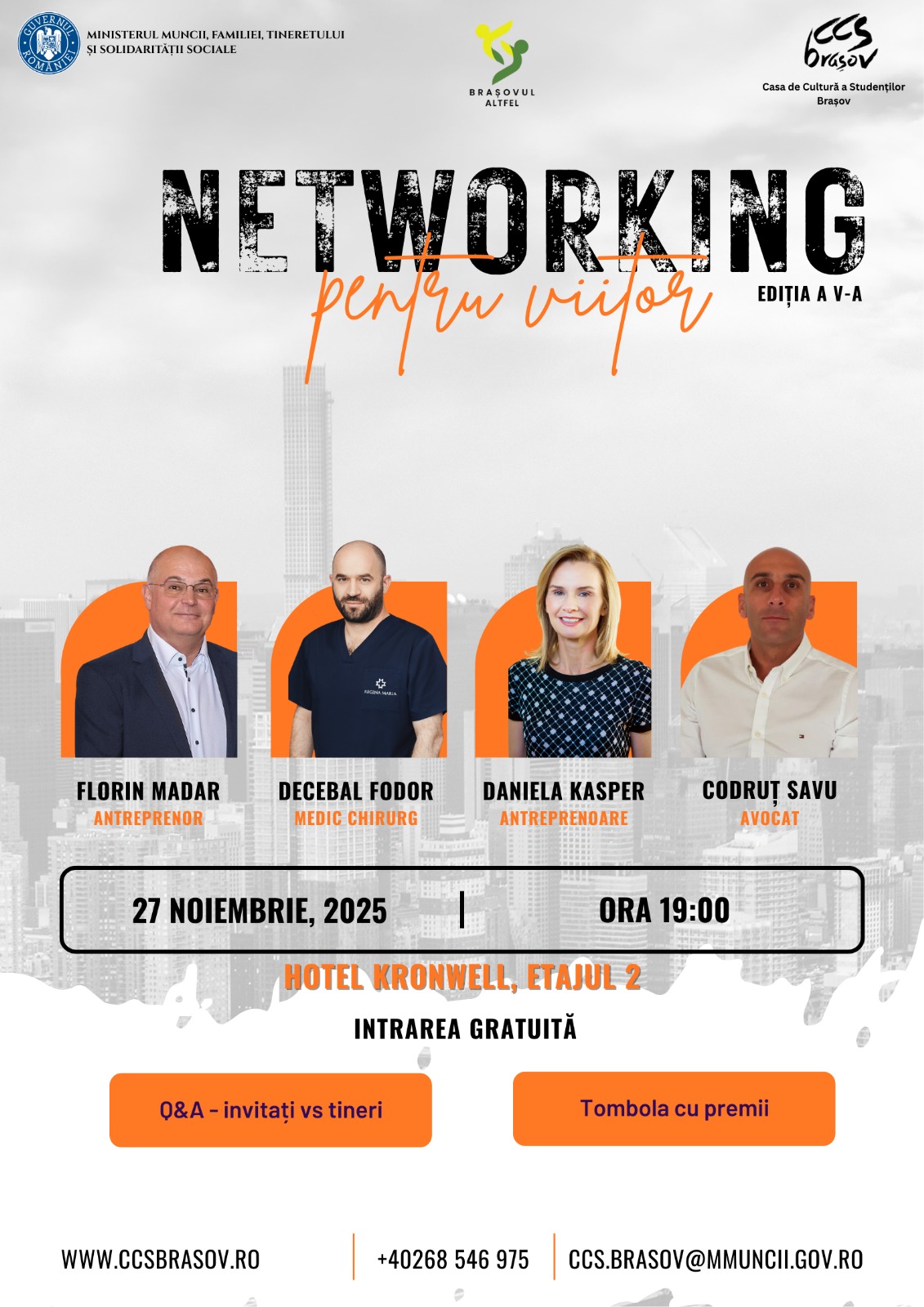 Casa de Cultură a Studenților din Brașov, în parteneriat cu asociația Brașovul Altfel, organizează joi, 27 noiembrie 2025, de la ora 18:45, cea de-a cincea ediție a evenimentului “Networking pentru viitor”. Întâlnirea, găzduită de Hotelul Kronwell, îi invită pe tinerii brașoveni să descopere perspectiva unor oameni de succes și să își găsească inspirația pentru propriul […]