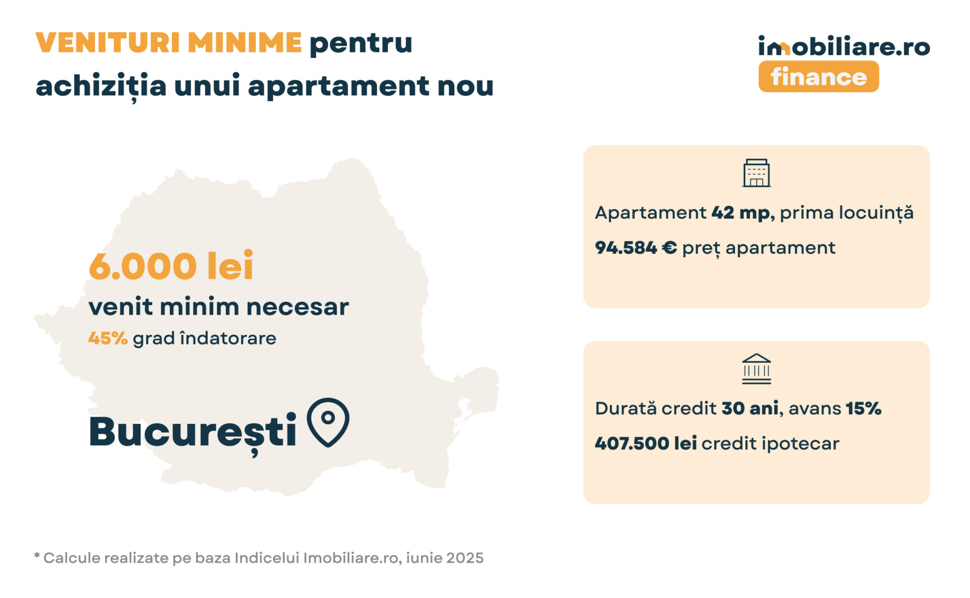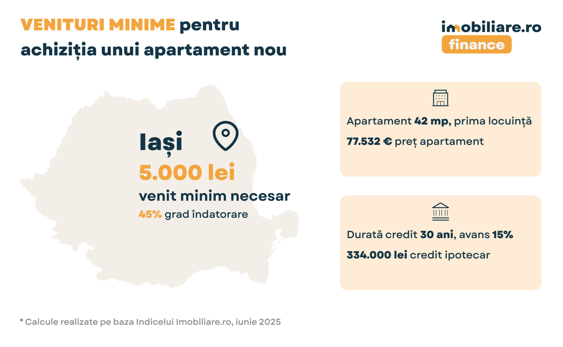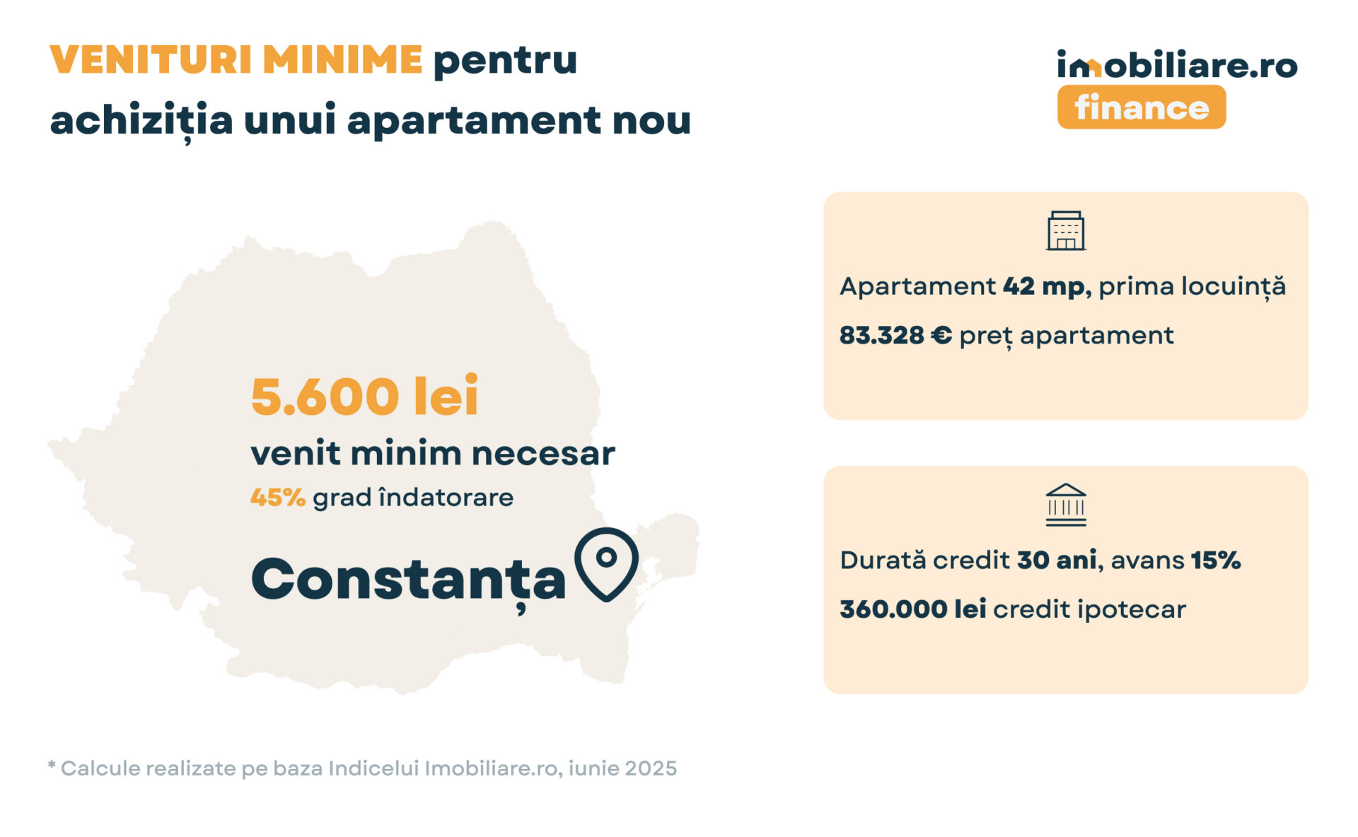 Prețul mediu plătit pe piața locală pentru un apartament nou cu o suprafață utilă de 42 mp este de 77.532 euro, iar în cazul în care achiți un avans minim de 15%, poți să-l cumperi obținând de la bancă un credit ipotecar în valoare 334.000 lei. Câștigurile minime lunare de care ai nevoie pentru accesarea acestui împrumut sunt de 5.000 lei.