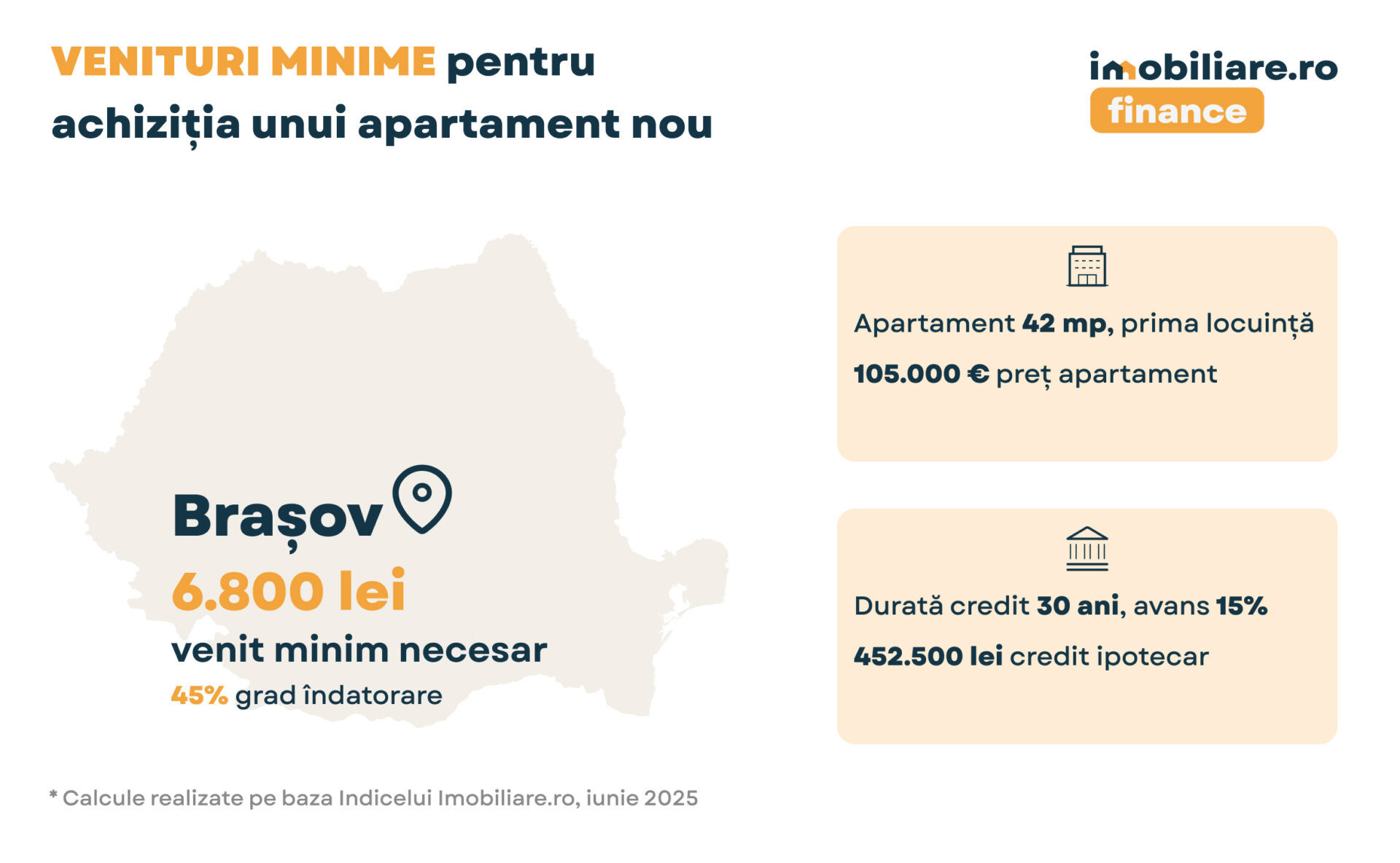 Brașov: Brașovenii achită, în medie, 2.500 euro/mp pentru un apartament nou, ceea ce se traduce printr-un cost de 105.000 euro pentru o locuință cu o suprafață de 42 mp. Pentru a cumpăra o astfel de proprietate, cu avans 15%, ei au nevoie de un împrumut în valoare de 452.500 lei, ce poate fi obținut în cazul în care câștigă lunar venituri de circa 6.800 lei, potrivit calculelor Imobiliare.ro Finance.