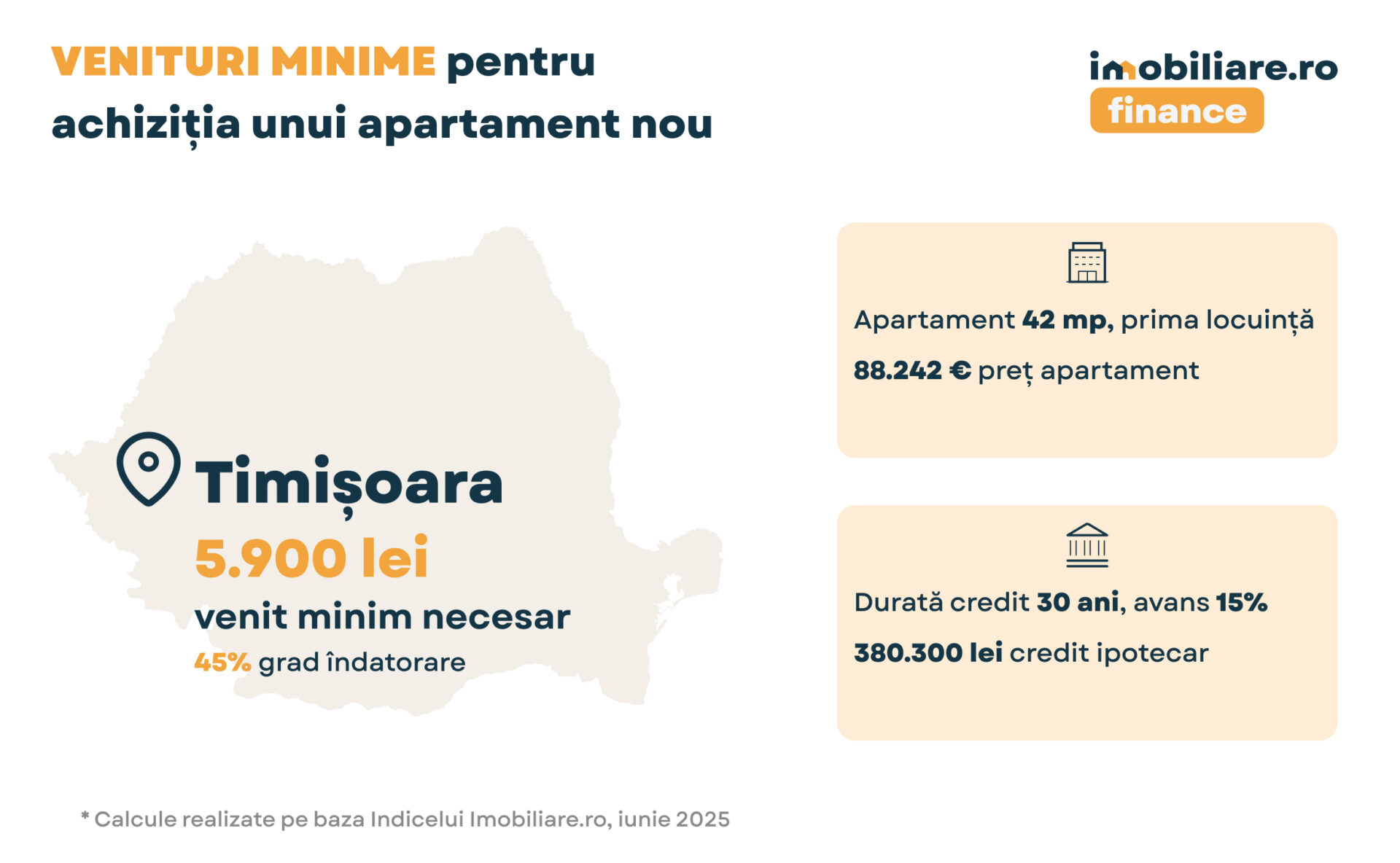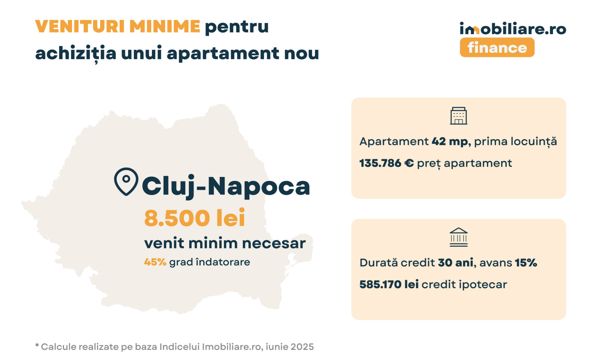 Imobiliare.ro Finance a realizat o analiză, pornind de la o locuință cu o suprafață utilă de 42 mp, pentru a le veni în ajutor românilor care vor să facă o achiziție înainte de termenul limită pentru TVA 9%. Rezultatele acesteia evidențiază veniturile necesare în Cluj-Napoca, Brașov, București, Timișoara, Constanța și Iași pentru obținerea unui credit ipotecar în vederea finalizării tranzacției.