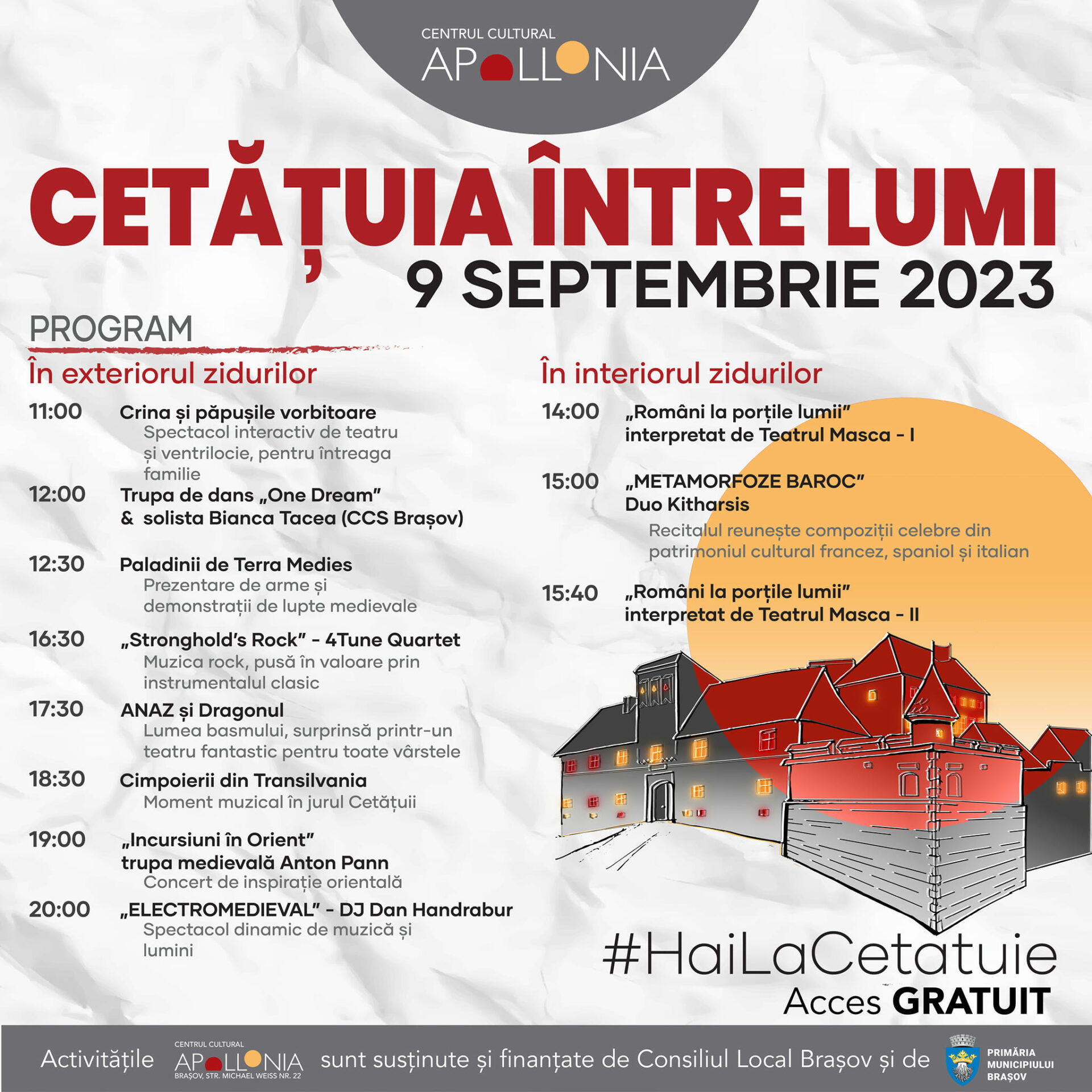 În prima zi, pe 8 septembrie,iIstoria se îmbină cu pulsul prezentului, prin momente muzicale de inspirație medievală, show-uri de lumini, dansuri contemporane, expoziții științifice, spectacole interactive și multe alte surprize. A doua zi de eveniment, 9 septembrie, aduce un program dinamic și captivant, deschis publicului de orice vârstă, așa că #HaiLaCetățuie!