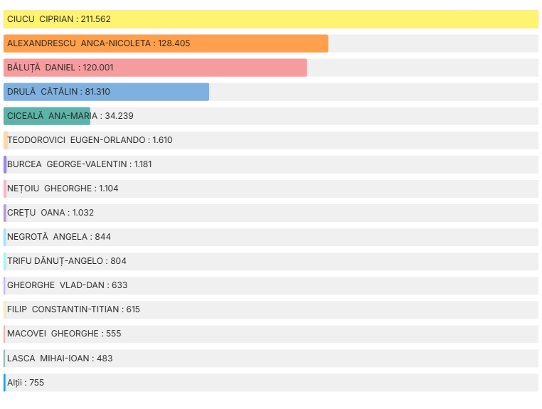 Ciucu a primit în total, 211.562 de voturi, Anca Alexandrescu 128.405, Băluță 120.001, Drulă 81.310 iar Ana Ciceală 34.239 de voturi.