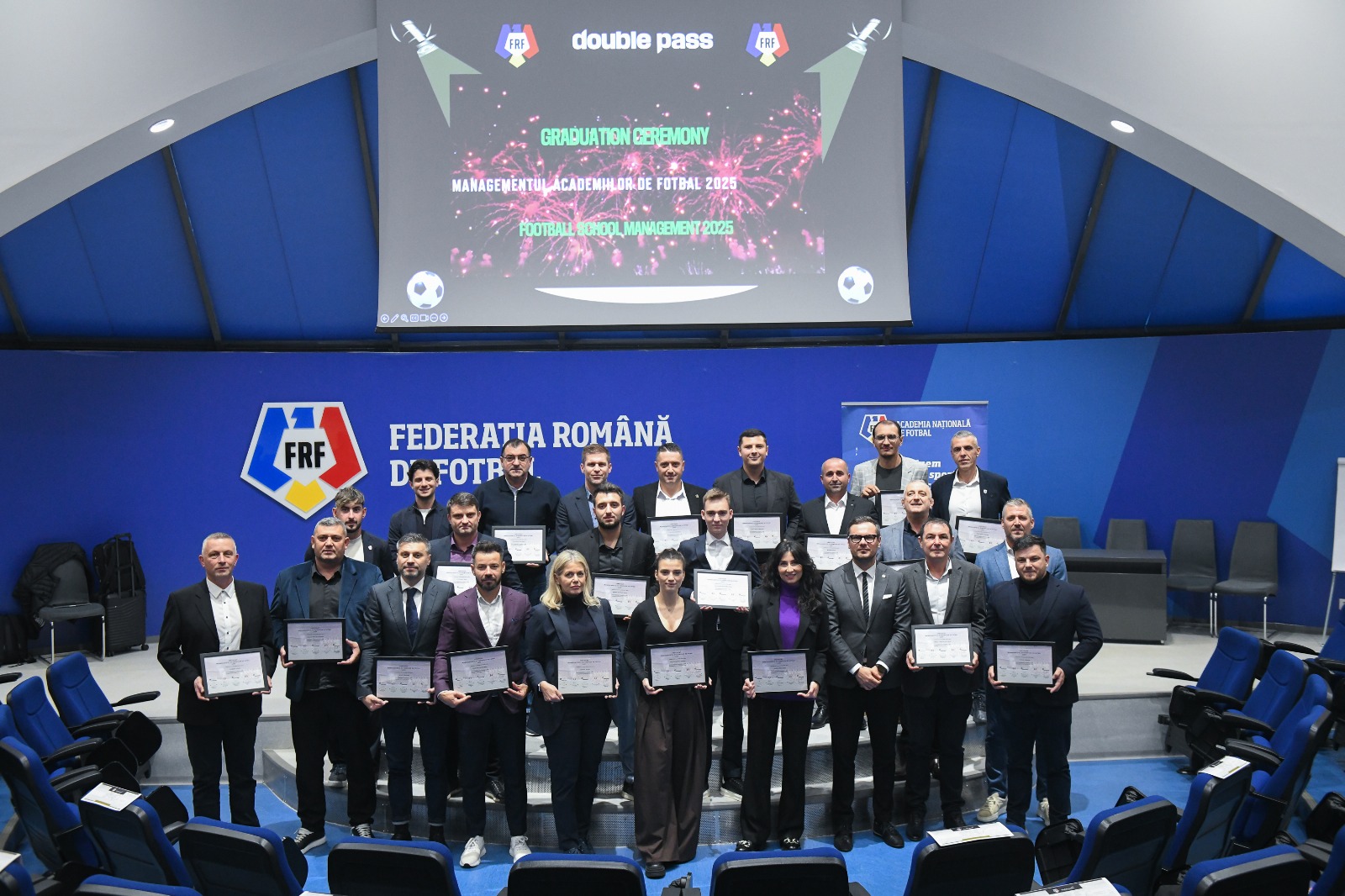 Lucrarea sa de absolvire, intitulată „Management de la bază spre vârf și leadership de la vârf spre bază”, a fost apreciată de profesorii prezenți – reprezentanți ai Federației Belgiene, Double Pass și FRF – și a primit aplauzele colegilor din program.