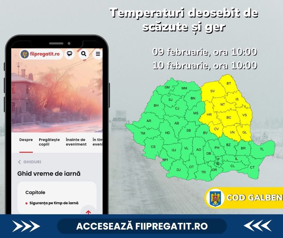 Meteorologii au emis o atenționare de COD GALBEN, ce anunță temperaturi deosebit de scăzute și ger, valabilă de astăzi, ora 10:00, până mâine, la ora 10:00. În Moldova și estul Transilvaniei, valorile termice minime se vor situa între -14 și -10 grade Celsius.