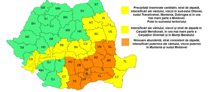 Începând de marți, 17 februarie, ora 10:00, și până miercuri, 18 februarie, ora 12:00, este în vigoare un cod galben, care vizează precipitații însemnate cantitativ, depuneri de strat de zăpadă, intensificări ale vântului, viscol și polei. Zonele afectate sunt sud-estul Olteniei, sudul Transilvaniei, Muntenia, Dobrogea și Moldova.