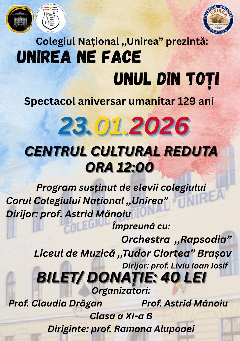 Evenimentul are loc astăzi, 23 ianuarie 2026, de la ora 12:00, la Centrul Cultural Reduta și este organizat de elevii și profesorii colegiului, în parteneriat cu Liceul de Muzică Tudor Ciortea, Centrul Cultural „Reduta” și Asociația Părinților Colegiului Național „Unirea” Brașov.