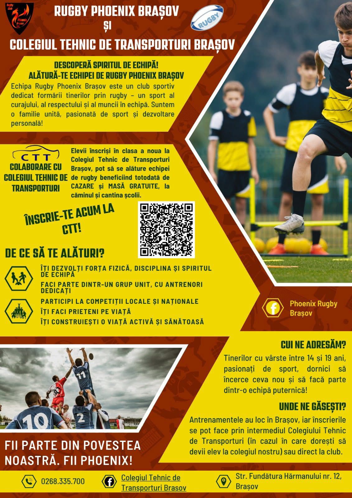 Viitorul începe la Brașov, cu educație de calitate și pasiune pentru sport! Colegiul Tehnic de Transporturi Brașov, în parteneriat cu clubul Rugby Phoenix, lansează o ofertă educațională și sportivă dedicată tinerilor între 14 și 19 ani, pasionați de tehnică și mișcare.