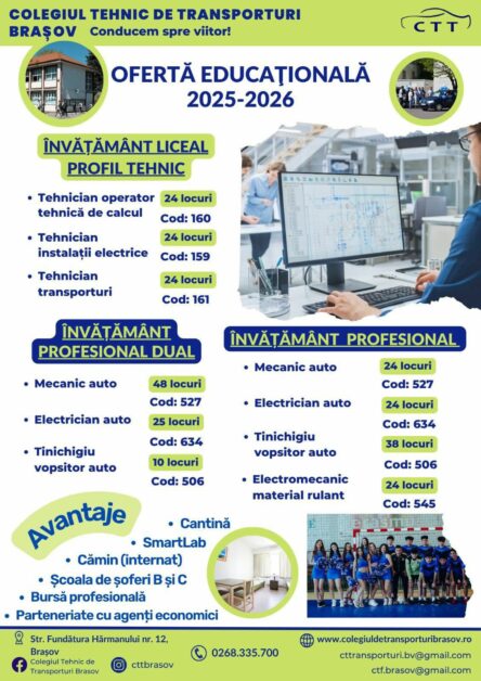 Informații educaționale: la secretariatul Colegiului Tehnic de Transporturi Brașov – Strada Fundătura Hărmanului nr. 12.