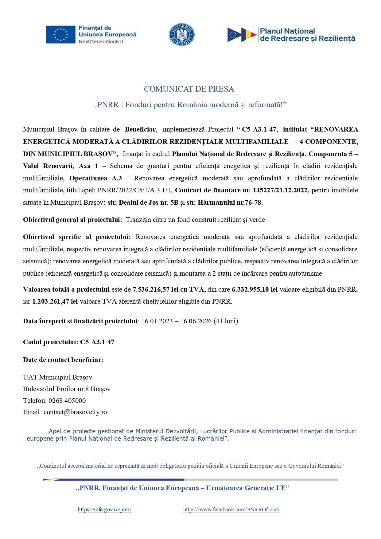 Municipiul Brașov în calitate de Beneficiar, implementează Proiectul “ C5-A3.1-47, intitulat “RENOVAREA ENERGETICĂ MODERATĂ A CLĂDIRILOR REZIDENȚIALE MULTIFAMILIALE – 4 COMPONENTE, DIN MUNICIPIUL BRAȘOV”, finanțat în cadrul Planului Național de Redresare și Reziliență, Componenta 5 – Valul Renovării, Axa 1 – Schema de granturi pentru eficiență enegetică și reziliență în clădiri rezidențiale multifamiliale, Operațiunea A.3 – Renovarea energetică moderată sau aprofundată a clădirilor rezidențiale multifamiliale, titlul apel: PNRR/2022/C5/1/A.3.1/1, Contract de finanțare nr. 145227/21.12.2022, pentru imobilele situate în Municipiul Brașov: str.Dealul de Jos nr.5B și str. Hărmanului nr.76-78.