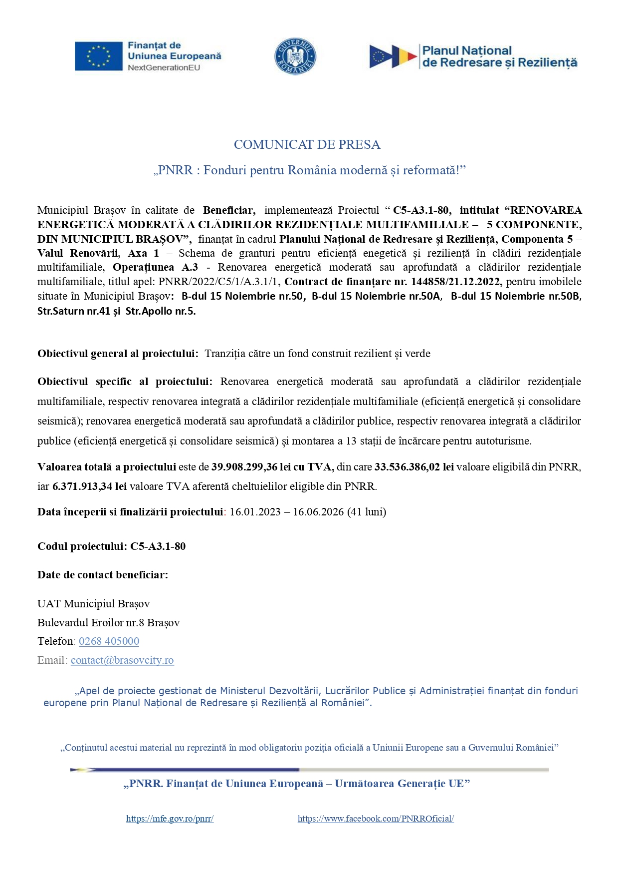 Municipiul Brașov în calitate de Beneficiar, implementează Proiectul “ C5-A3.1-80, intitulat “RENOVAREA ENERGETICĂ MODERATĂ A CLĂDIRILOR REZIDENȚIALE MULTIFAMILIALE – 5 COMPONENTE, DIN MUNICIPIUL BRAȘOV”, finanțat în cadrul Planului Național de Redresare și Reziliență, Componenta 5 – Valul Renovării, Axa 1 – Schema de granturi pentru eficiență enegetică și reziliență în clădiri rezidențiale multifamiliale, Operațiunea A.3 – Renovarea energetică moderată sau aprofundată a clădirilor rezidențiale multifamiliale, titlul apel: PNRR/2022/C5/1/A.3.1/1, Contract de finanțare nr. 144858/21.12.2022, pentru imobilele situate în Municipiul Brașov: B-dul 15 Noiembrie nr.50, B-dul 15 Noiembrie nr.50A, B-dul 15 Noiembrie nr.50B, Str. Saturn nr.41 și Str. Apollo nr.5.