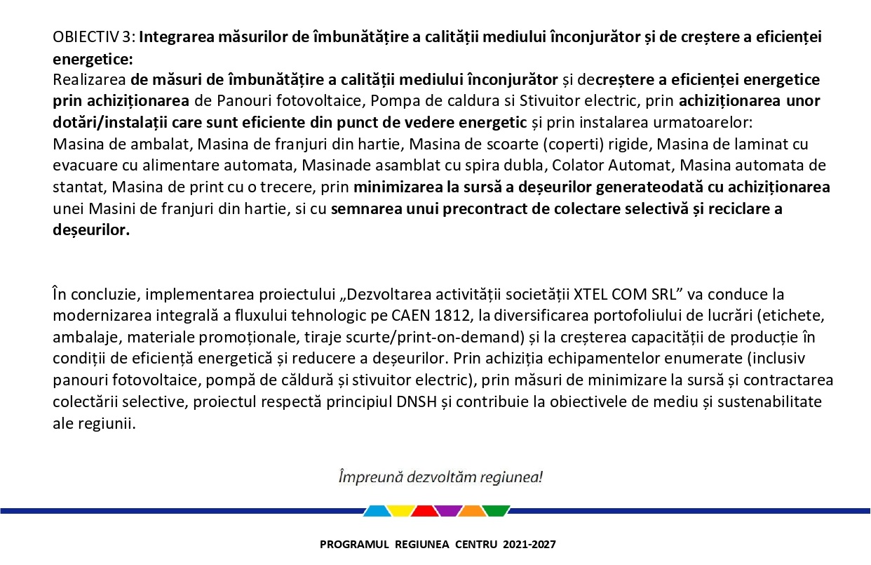 În concluzie, implementarea proiectului „Dezvoltarea activității societății XTEL COM SRL” va conduce la modernizarea integrală a fluxului tehnologic pe CAEN 1812, la diversificarea portofoliului de lucrări (etichete, ambalaje, materiale promoționale, tiraje scurte/print-on-demand) și la creșterea capacității de producție în condiții de eficiență energetică și reducere a deșeurilor. Prin achiziția echipamentelor enumerate (inclusiv panouri fotovoltaice, pompă de căldură și stivuitor electric), prin măsuri de minimizare la sursă și contractarea colectării selective, proiectul respectă principiul DNSH și contribuie la obiectivele de mediu și sustenabilitate ale regiunii.