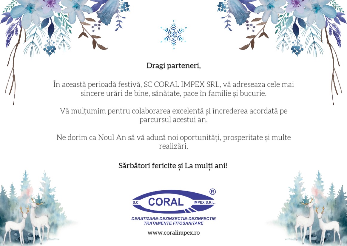 În prag de sărbători, compania SC CORAL IMPEX SRL transmite partenerilor și colaboratorilor săi un mesaj de mulțumire pentru întreaga activitate desfășurată pe parcursul anului, alături de urări calde pentru sezonul festiv și pentru Noul An.