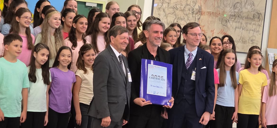Distincția atestă participarea membrilor corului la spectacolele susținute la sediul Națiunilor Unite din Viena, în zilele de 17 și 18 iulie 2025.