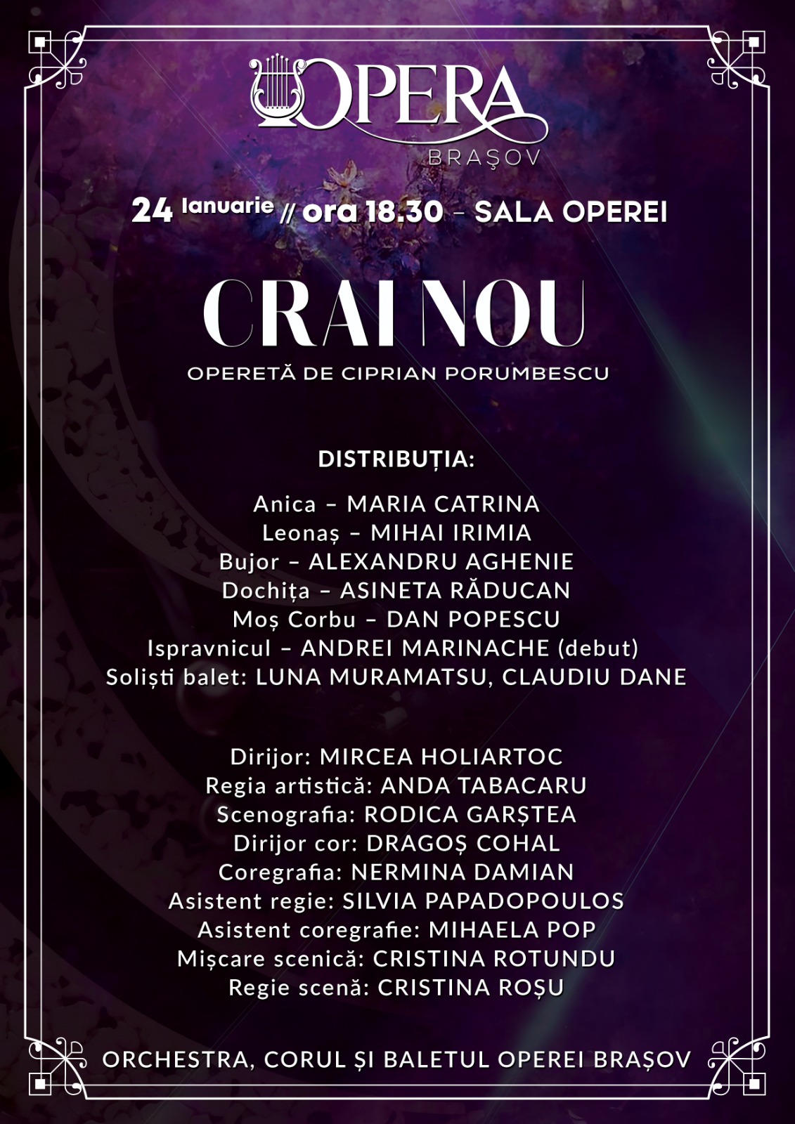 Sâmbătă, 24 ianuarie 2026, de la ora 18.30, în Sala de pe strada Bisericii Române nr. 51, Opera Brașov prezintă, de Ziua Unirii Principatelor Române, spectacolul cu prima operetă românească: „Crai Nou” de Ciprian Porumbescu.