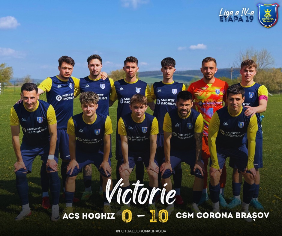 CSM Corona Brașov continuă parcursul foarte bun din Liga a IV-a la fotbal, după o nouă victorie categorică obținută în deplasare, în etapa a 19-a. Echipa noastră a câștigat cu scorul de 0-10 partida disputată pe terenul formației ACS Hoghiz.