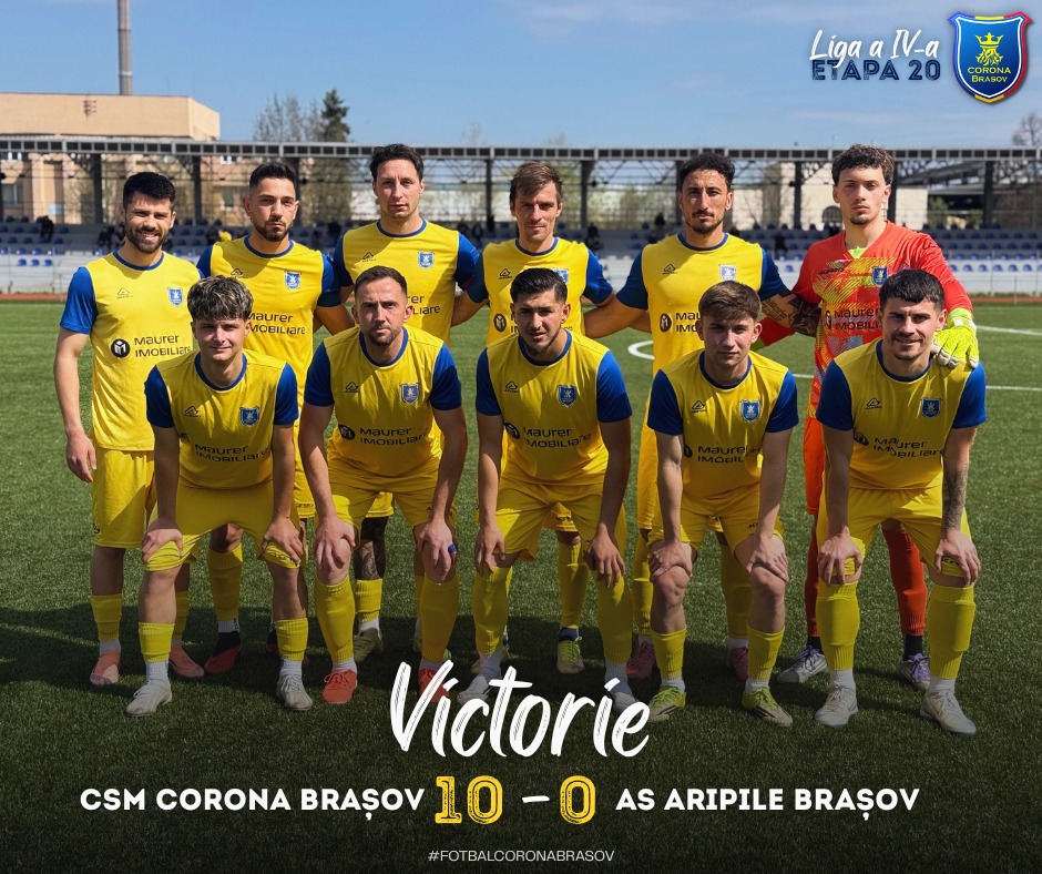 CSM Corona Brașov continuă seria rezultatelor foarte bune în Liga a IV-a la fotbal, după o nouă victorie categorică obținută pe teren propriu, în etapa a 20-a. Echipa noastră a câștigat cu scorul de 10-0 partida disputată împotriva formației A.S. Aripile Brașov.