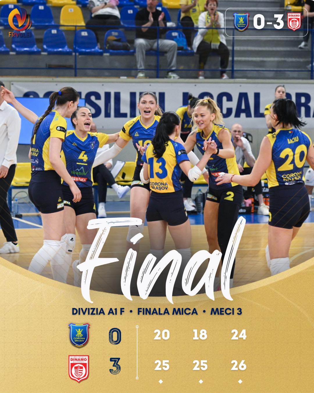 Voleibalistele de la CSM Corona Brașov au încheiat sezonul 2025–2026 pe locul 4, după o finală mică intens disputată împotriva formației Dinamo București.