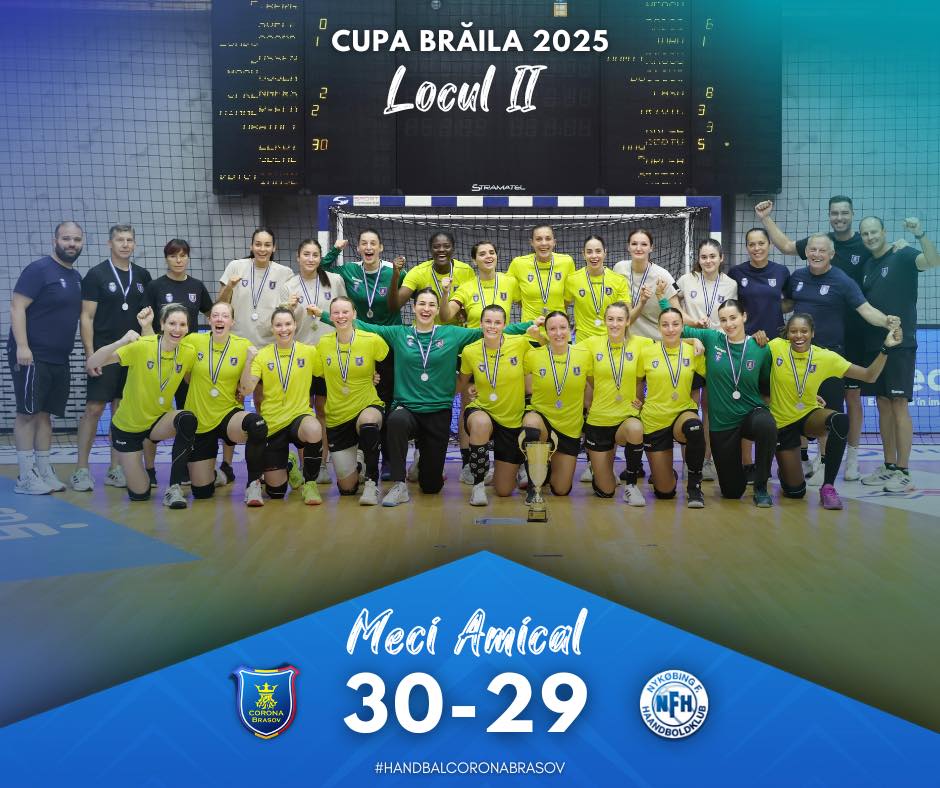 Echipa de handbal senioare a CSM Corona Brașov a încheiat turneul amical „Cupa Brăila” pe locul secund, după o serie de meciuri disputate la intensitate maximă. În ultimul joc al competiției, formația brașoveană a obținut o victorie de prestigiu, 30–29, în fața puternicei echipe daneze Nykøbing Falster, confirmând forma bună de pregătire în această perioadă precompetițională.