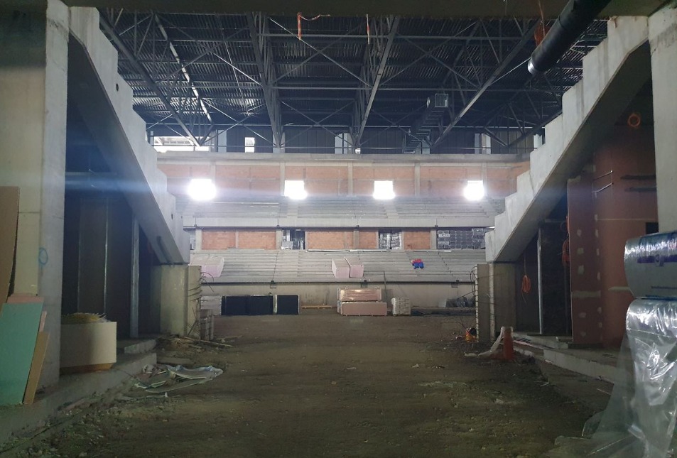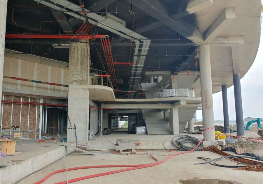 Lucrările de zidărie în sala mare sunt aproape finalizate, ajungând la peste 95%, iar compartimentările de gips-carton ating 75% din proiect. În această fază, se montează deja structura metalică a fațadei, care va integra panouri de policarbonat și lumini LED programabile, conferind clădirii un aspect exterior spectaculos și modern.