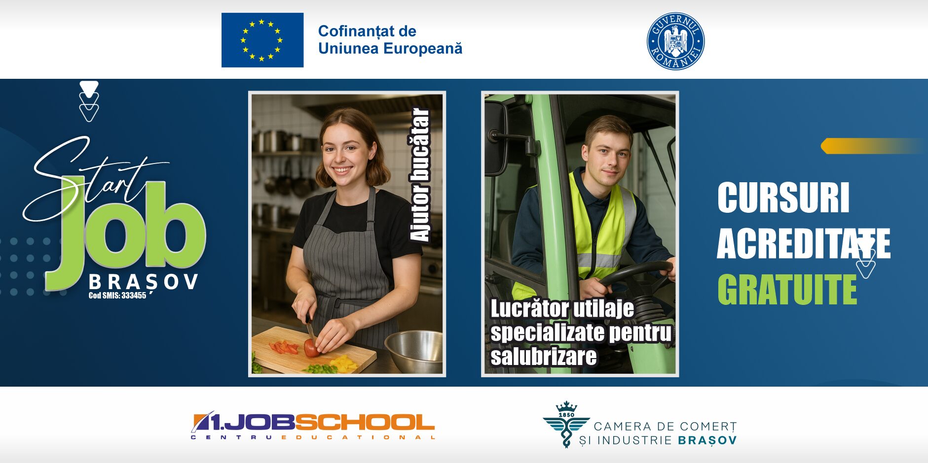În cadrul proiectului „StartJob Brașov” vor fi organizate cursuri gratuite acreditate A.N.C., precum „Lucrător utilaje specializate pentru salubrizare” și „Ajutor bucătar”, fiecare având o durată de 180 de ore (60 ore teorie și 120 ore practică), oferind participanților calificări recunoscute și relevante pentru piața muncii.