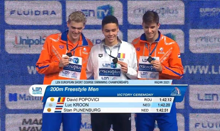 Sportivul român David Popovici a câştigat medalia de aur în proba de 200 m liber, sâmbătă, la Campionatele Europene de înot în bazin scurt (25 de metri) de la Kazan (Rusia), cu timpul de 1 min 42 sec 12/100.