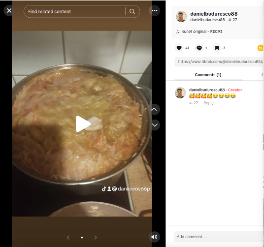 Clipul video de mai jos a fost clonat de pe contul original “daniewov66p” și distribuit de “danielburudescu88”, dar în audio include o înregistrare a unui discurs al lui Călin Georgescu. Aceasta este o tactică folosită de influenceri care încearcă să capteze atenția privitorilor printr-un anumit conținut vizual, în timp ce avansează narațiuni specifice prin intermediul audio-ului sau “efectului sonor” al videoclipului.