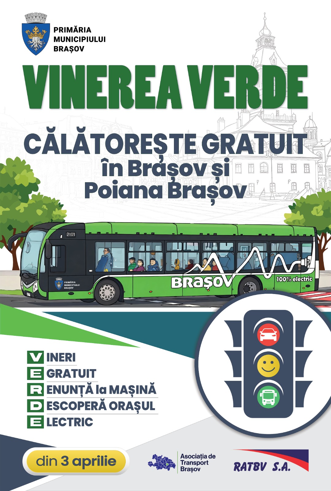 «Vinerea Verde» este proiectul prin care dăm posibilitatea brașovenilor și celor care ne vizitează să lase mașinile acasă și să circule, în fiecare vineri, cu transportul în comun”, a explicat primarul George Scripcaru. Tot din această săptămână, din 1 aprilie, intră în vigoare și alte facilități la transportul în comun: persoanele peste 70 de ani, indiferent de venit, și pensionarii cu pensii de până la 3.600 de lei, vor avea transport gratuit.