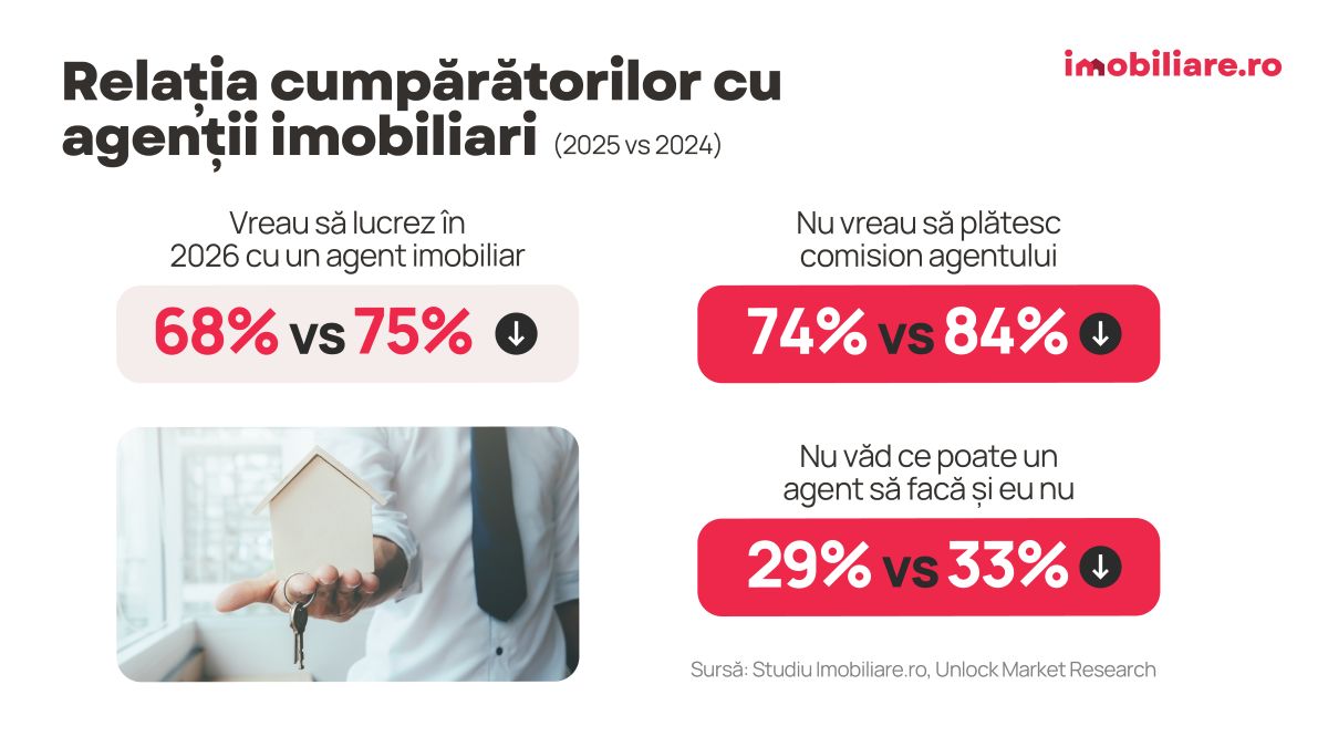 În plus, dacă la finele lui 2024, 32% dintre respondenți recunoșteau că nu au încredere în calitatea serviciilor oferite de agenții imobiliari și credeau, de exemplu, că aceștia nu pot negocia cel mai bun preț pentru ei în tranzacție, lucrurile s-au schimbat în 2025. Doar 27% dintre cei intervievați mai au o astfel de părere, semn că inițiativele de profesionalizare a breslei și de îmbunătățire a serviciilor oferite de profesioniști dau deja roade.