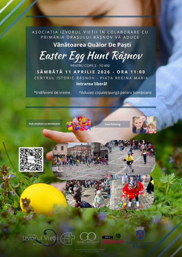 Copiii din Râșnov vor fi invitați sâmbătă, 11 aprilie 2026, de la ora 11:00, în Piața Unirii, la evenimentul „Easter Egg Hunt”, organizat de Asociația Izvorul Vieții în colaborare cu Primăria Orașului Râșnov.