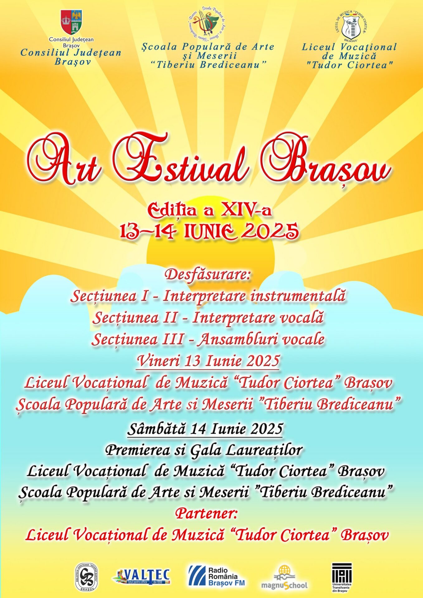 Festivalul Concurs Naţional de Interpretare „Art Estival Braşov”, ediţia a XIV-a, va avea loc în zilele de 13 şi 14 iunie, în organizarea asigurată de Şcoala Populară de Arte şi Meserii „Tiberiu Brediceanu” Braşov în parteneriat cu Liceul Vocaţional de Muzică „Tudor Ciortea”.