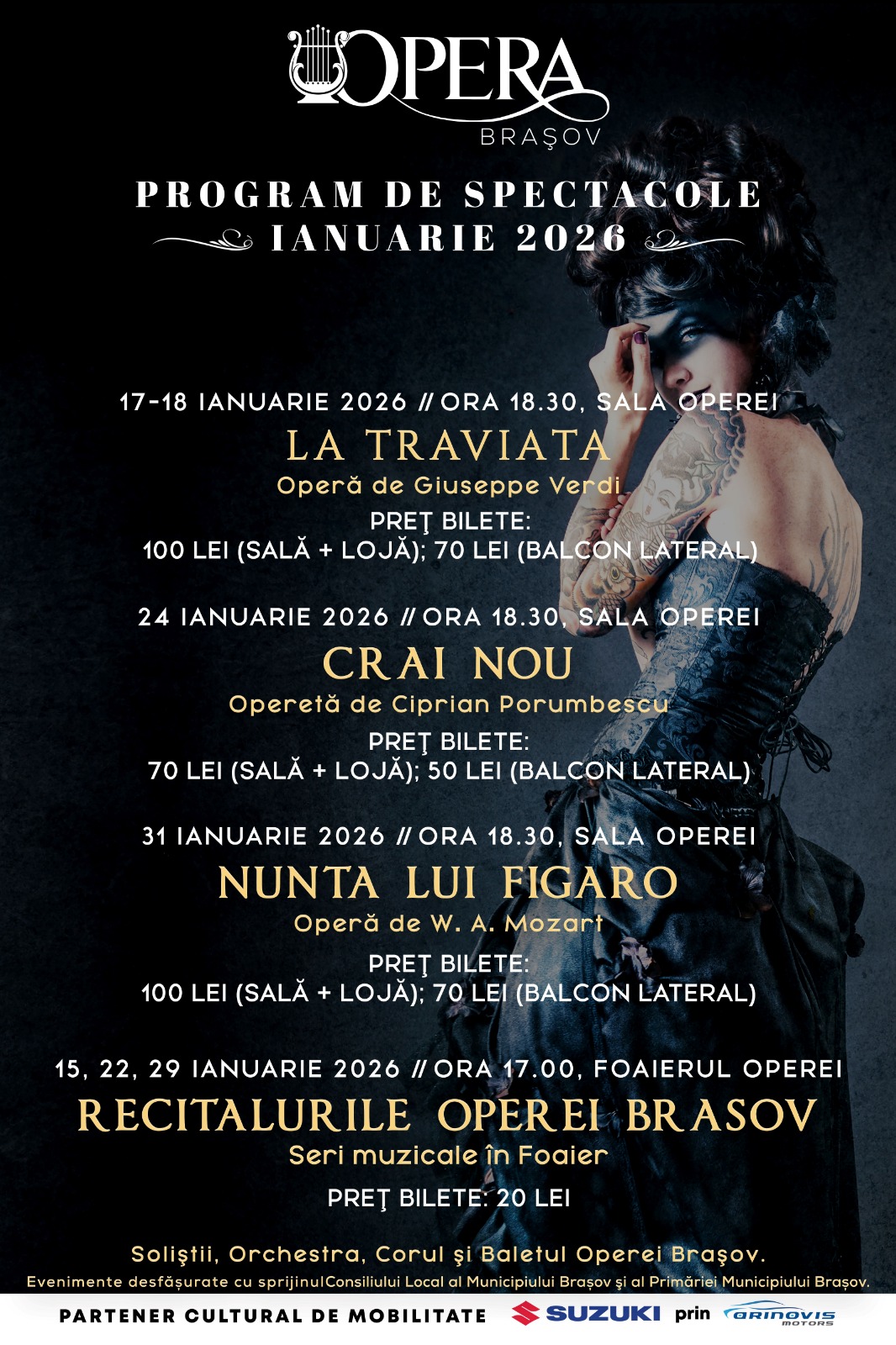 Biletele pentru toate aceste evenimente se pun în vânzare joi, 8 ianuarie 2026, de la ora 10.00, atât online, pe site-ul www.bilet.ro, cât și la sediul Operei Brașov. Program Casierie: Luni – Vineri 10 – 17 și cu o oră înainte de începerea spectacolelor (în cazul în care rămân bilete disponibile).