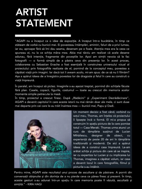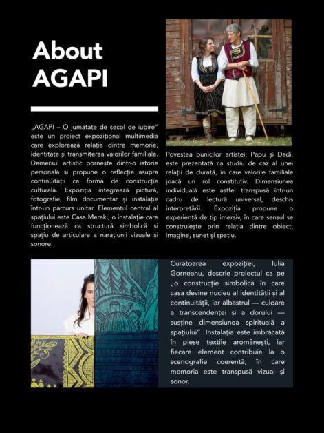 Expoziția „AGAPI – O jumătate de secol de iubire”, semnată de artista Kira Hagi, propune publicului un parcurs multimedia în care trecutul și prezentul se întâlnesc într-o reflecție sensibilă asupra valorilor familiale și a identității. Proiectul îmbină armonios pictura, fotografia, filmul documentar și instalația, conturând o experiență artistică unitară și profund personală.