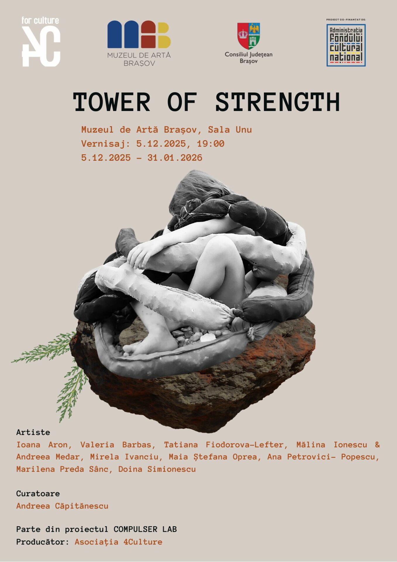 Muzeul de Artă Brașov și Asociația 4Culture vă invită vineri, 5 decembrie 2025, de la ora 19:00, la vernisajul expoziției de grup „Tower of Strength”. Evenimentul va avea loc la sediul muzeului din Bulevardul Eroilor nr. 21, Sala unu.