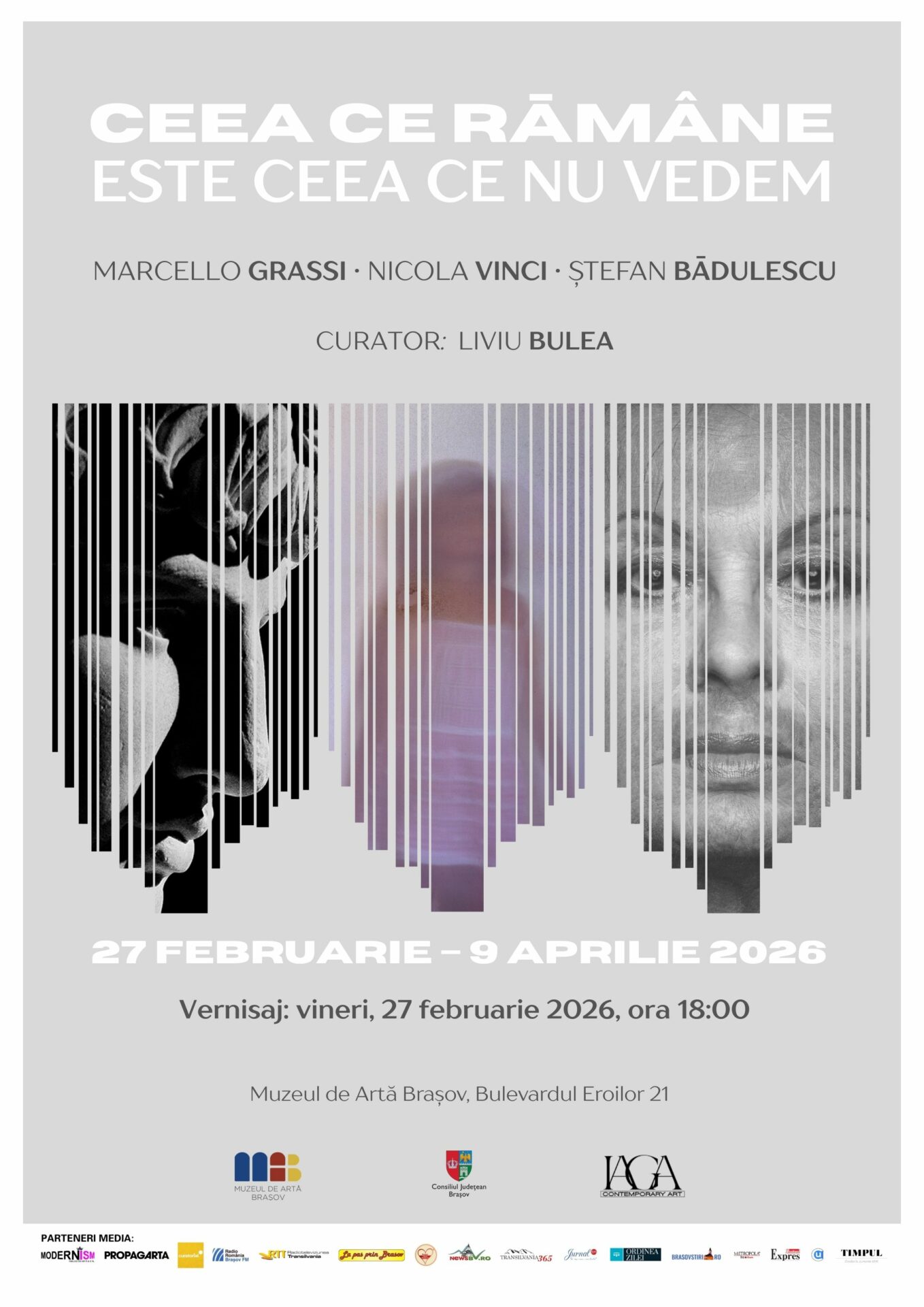 Muzeul de Artă Brașov, în parteneriat cu Galeria IAGA Contemporary Art, vă invită vineri, 27 februarie 2026, de la ora 18:00, la vernisajul expoziției „Ceea ce rămâne este ceea ce nu vedem”, curatoriată de Liviu Bulea. Expoziția reunește creațiile a trei artiști, Ștefan Bădulescu, Nicola Vinci și Marcello Grassi, ale căror lucrări transformă fotografia într-un limbaj al introspecției, al memoriei și al unei căutări atemporale.
