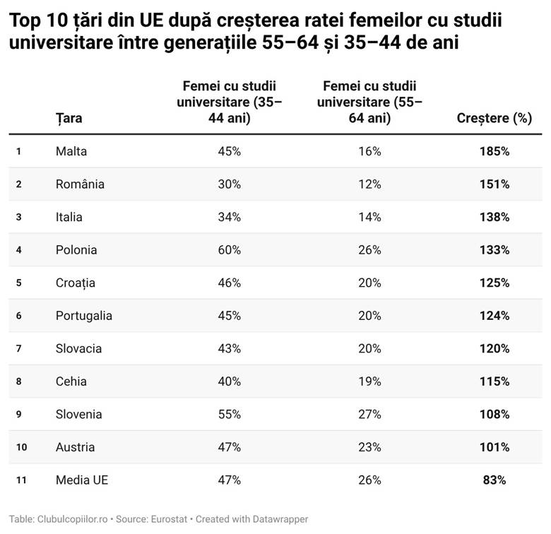În ultimele două generații, România a trecut printr-o veritabilă revoluție educațională: ponderea femeilor cu studii universitare a crescut de la aproximativ 12% la circa 30% — o creștere de aproximativ 151%, printre cele mai mari din Uniunea Europeană.