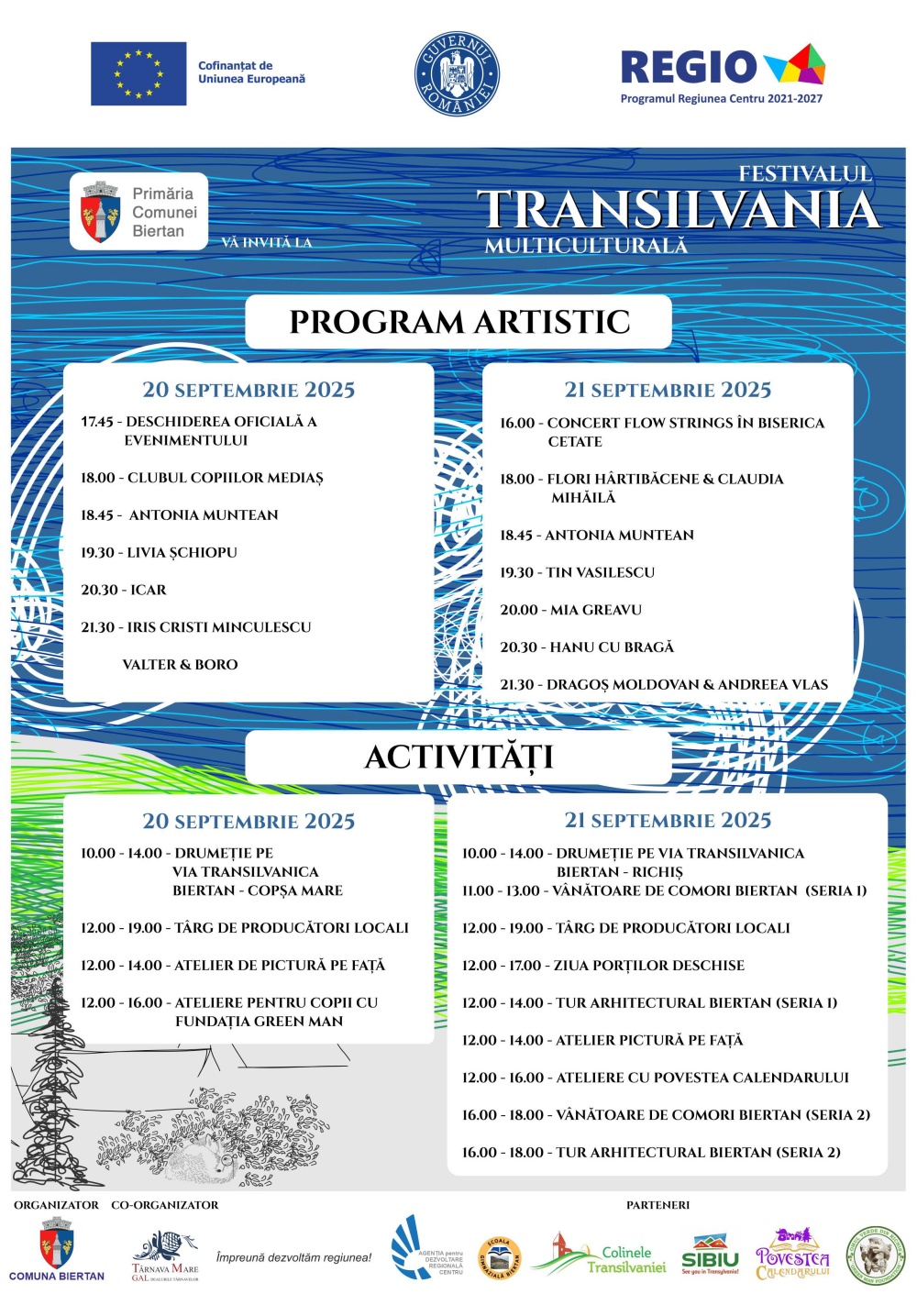 În weekendul 20–21 septembrie 2025, comuna Biertan (Sibiu) găzduiește o nouă ediție a Festivalului Transilvania Multiculturală, unul dintre cele mai importante evenimente din calendarul cultural al regiunii. Timp de două zile, inima satului de poveste se va transforma într-un spațiu viu al întâlnirii dintre tradiție, diversitate culturală și comunitate.