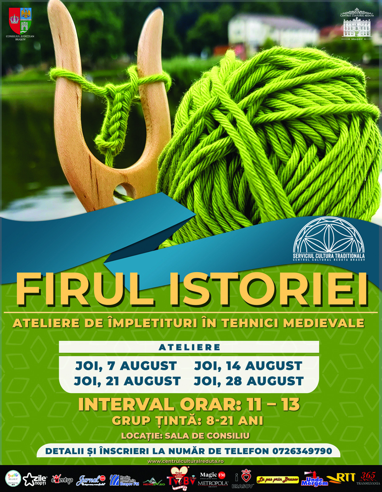Centrul Cultural Reduta invită copiii și tinerii cu vârste între 8 și 21 de ani să participe gratuit la atelierele de împletituri  „Firul Istoriei”, care se vor desfășura în fiecare zi de joi a lunii august: 7, 14, 21 și 28 august 2025, în intervalul orar 11:00 – 13:00, în Sala de Consiliu de la etajul 2.