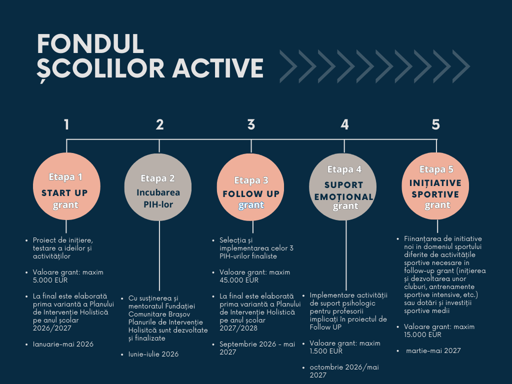 Ghidul aplicantului care conține prezentarea generală a programului, calendarul procesului de aplicare, informații despre evaluare, implementare, monitorizare și raportare poate fi accesat la adresa:https://fundatiacomunitarabrasov.ro/fondul-scolilor-active/