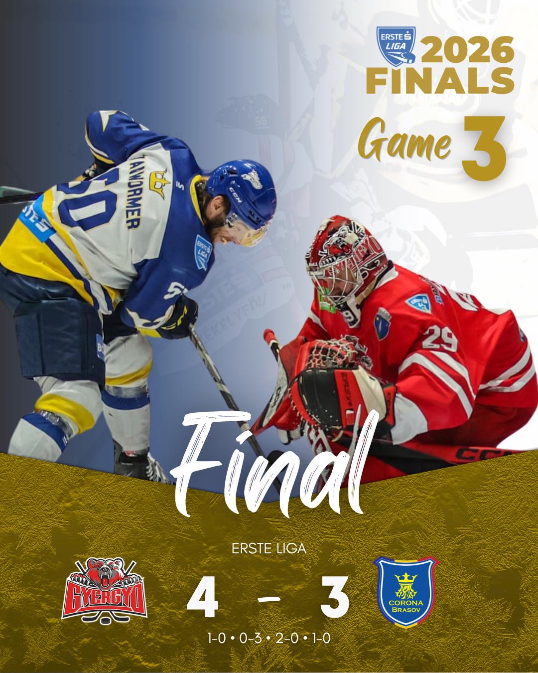 În meciul 3 din finala Erste Liga, Corona Brașov a fost învinsă în prelungiri de ACSH Gheorgheni, scor 4-3, după ce a avut un avantaj de două goluri.