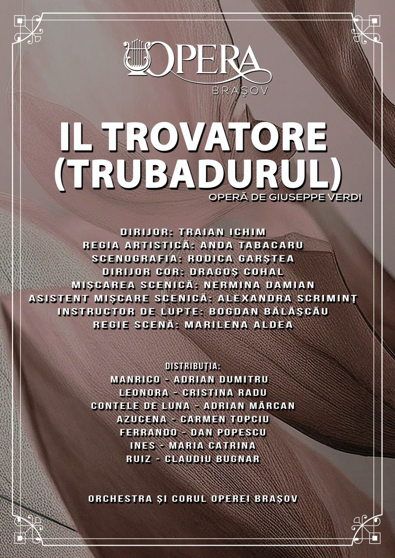 Sâmbătă, 14 iunie 2025, de la ora 18.30, în sala Operei Brașov, se va desfășura spectacolul cu opera „Il Trovatore” (Trubadurul) de Giuseppe Verdi, ce dezvoltă o temă romantică, prin excelență.