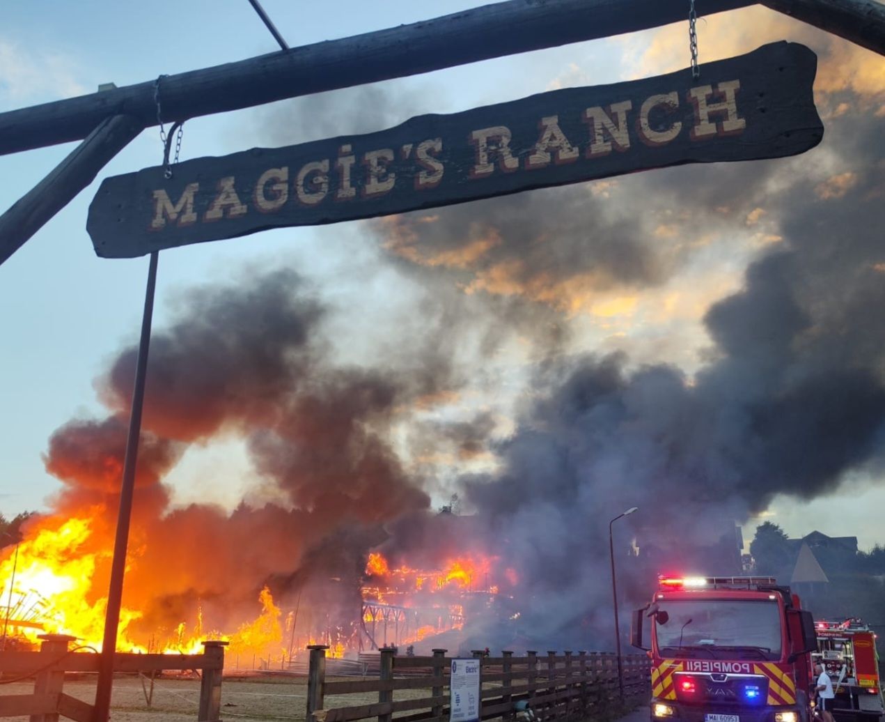 Un incendiu puternic a cuprins, ieri seară, complexul turistic Maggie’s Ranch de pe Valea Glăjeriei din Râşnov. Focul, pornit de la un grajd, s-a extins la unitatea turistică, extinzându-se pe o suprafaţă de 2000 de metri pătraţi.