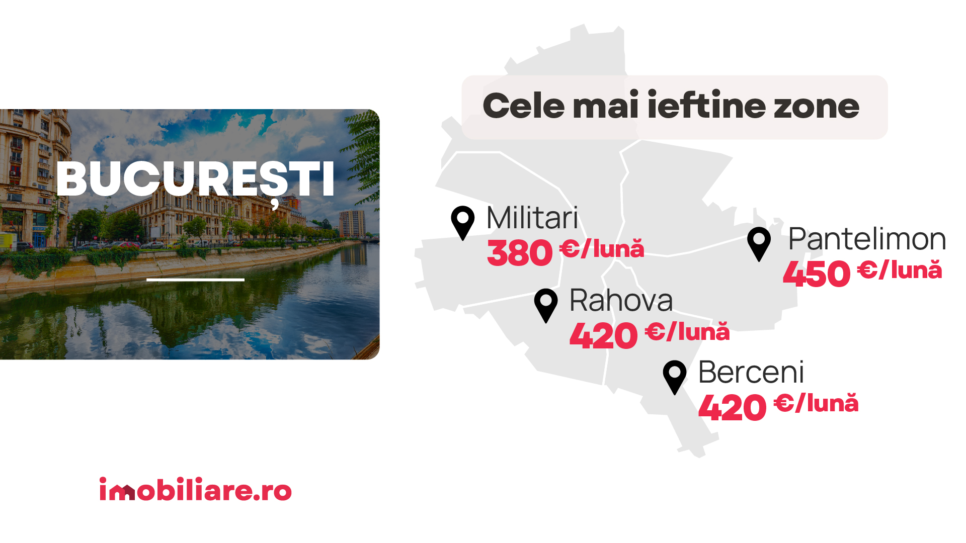 Cele mai accesibile chirii pot fi găsite în cartiere precum Militari (380 euro/lună), Berceni sau Rahova (430 euro/lună). Cu un buget mediu de 450 euro/lună poți găsi un apartament de închiriat și în zone precum Titan, Prelungirea Ghencea, Pantelimon, Giurgiului, Apărătorii Patriei sau 1 Decembrie 1918.