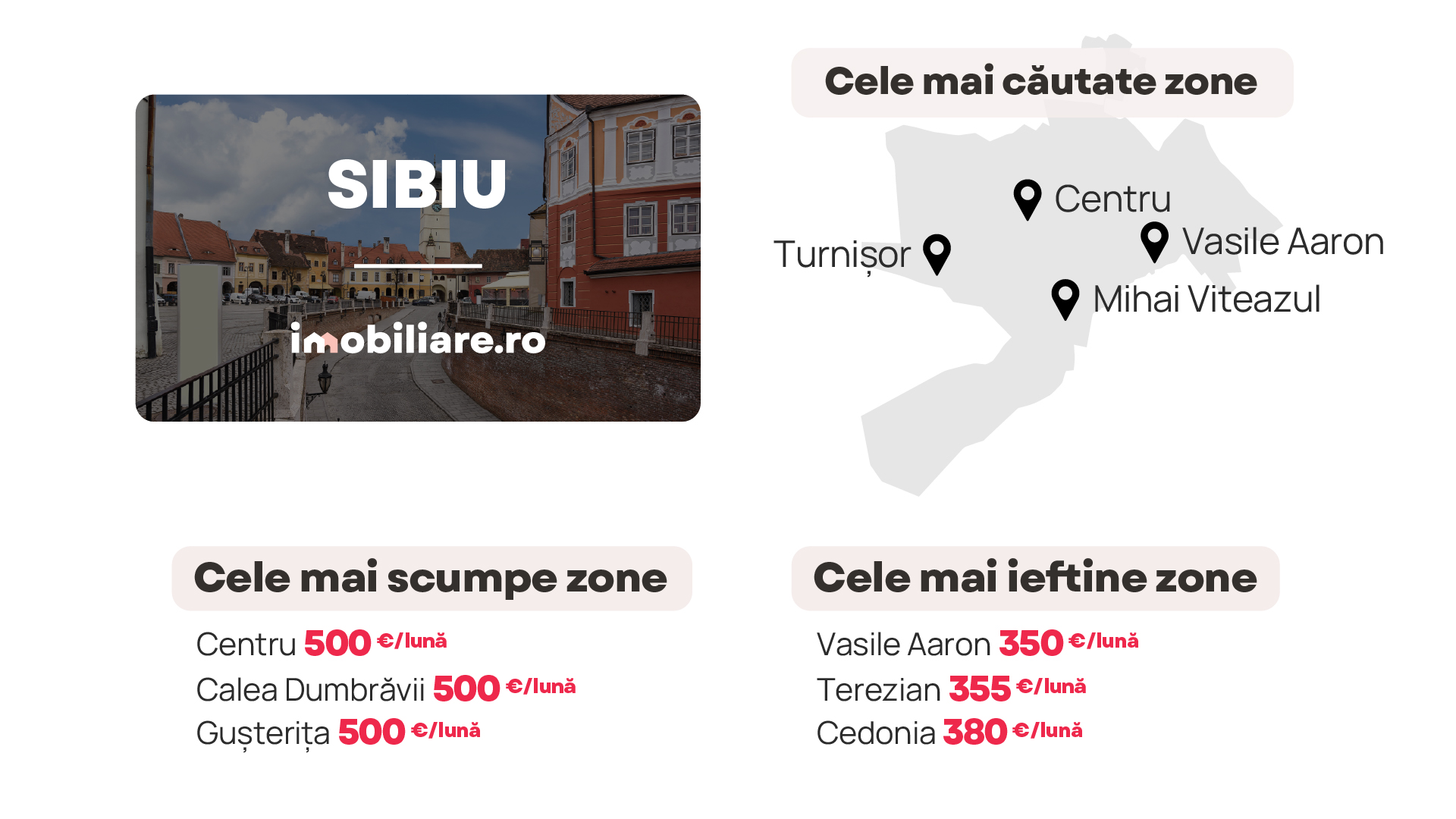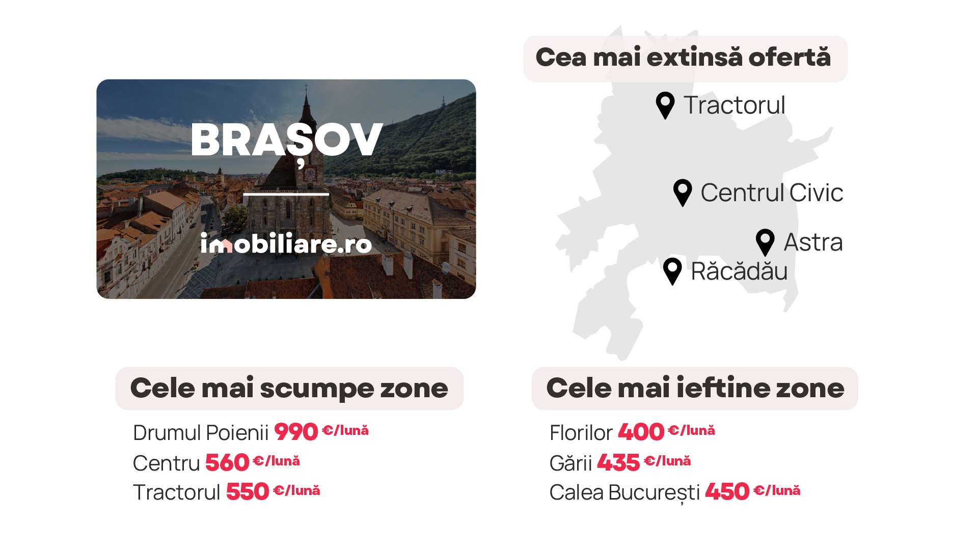 Proprietățile cu cele mai piperate prețuri pot fi găsite în zona Drumul Poienii. Chiria medie pentru un apartament ajunge aici la 990 euro/lună. Locuințele poziționate central pot fi închiriate cu 560 euro/lună, iar cele din cartierul Tractorul cu 550 euro/lună. Cele mai multe apartamente disponibile chiriașilor în zona Tractorul se află în blocuri finalizate pe parcursul ultimilor ani. Plătesc, în medie, 500 euro/lună și cei care vor să se mute cu chirie în Centrul Civic, Astra, Răcădău sau Bartolomeu.