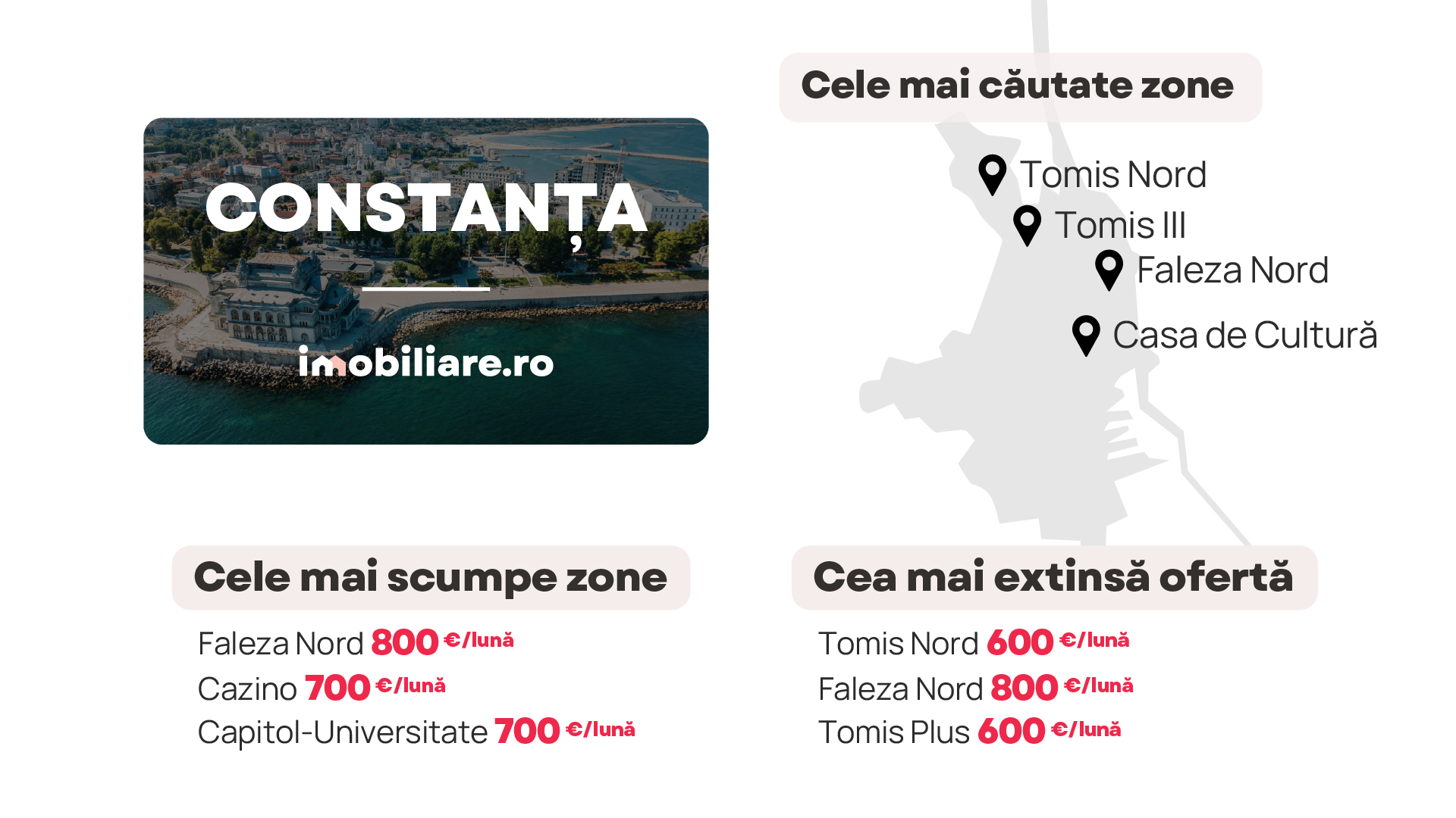 Persoanele care își doresc să achite o chirie cât mai mică ar trebui să-și înceapă căutarea următoarei lor locuințe în zone precum Far (360 euro/lună), Tomis II (450 euro/lună) și Tomis III (450 euro/lună). Aceasta din urmă este, însă, una dintre cele mai căutate din oraș, motiv pentru care competiția pentru cele mai moderne locuințe la cele mai bune prețuri ar putea fi destul de mare în următoarea perioadă. O altă zonă populară în rândul celor care își caută o chirie în Constanța este și cea din apropierea Casei de Cultură. Aici, chiria medie ajunge la 500 euro/lună.
