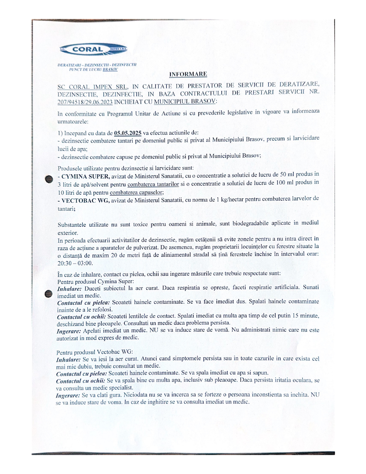 Informare – Acțiuni de deratizare, dezinsecție și dezinfecție în Municipiul Brașov, efectuate de SC Coral Impex SRL