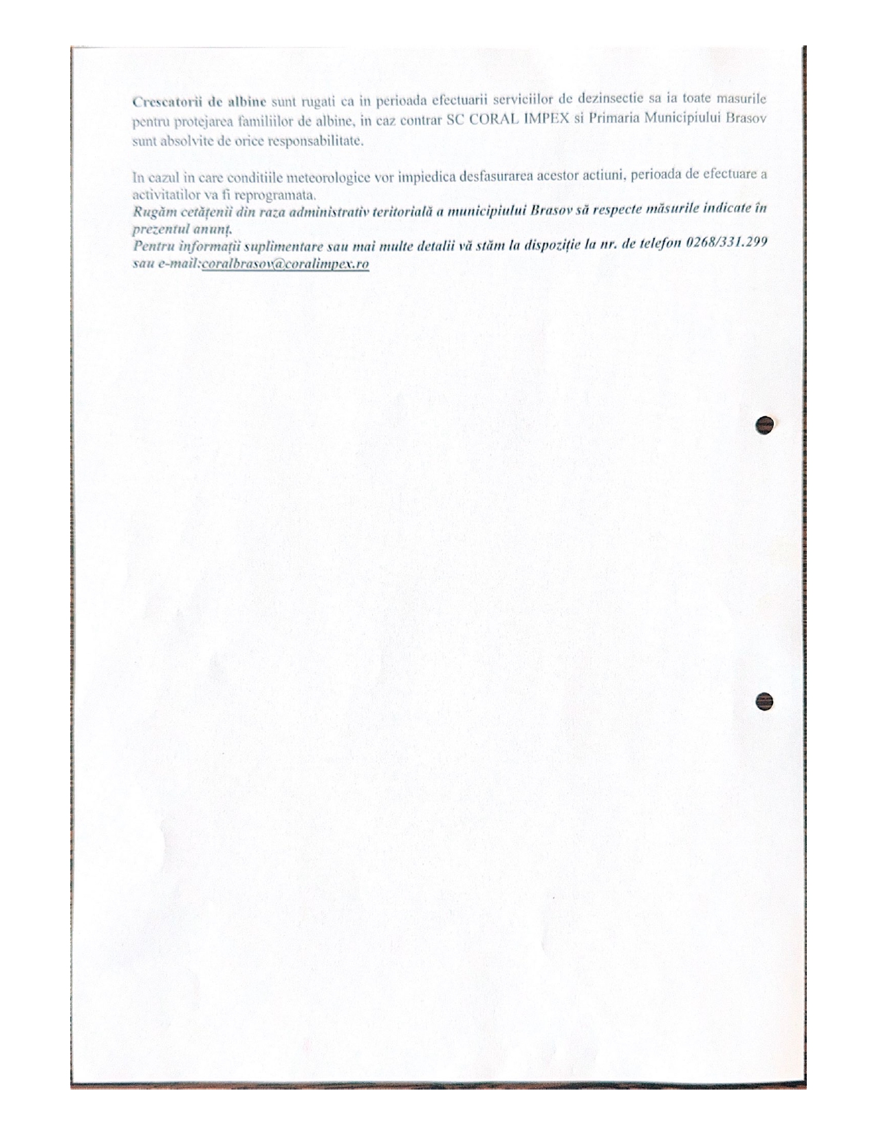 Crescătorii de albine sunt rugați ca în perioada efectuării serviciilor de dezinsecție să ia toate măsurile pentru protejarea familiilor de albine, în caz contrar SC CORAL IMPEX și Primăria Municipiului Brașov sunt absolvite de orice responsabilitate.