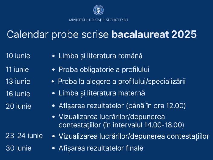 Probele scrise din sesiunea iunie a examenului național de bacalaureat 2025 se vor desfășura în perioada 10 – 16 iunie, în 447 de centre de examen, după următorul calendar: